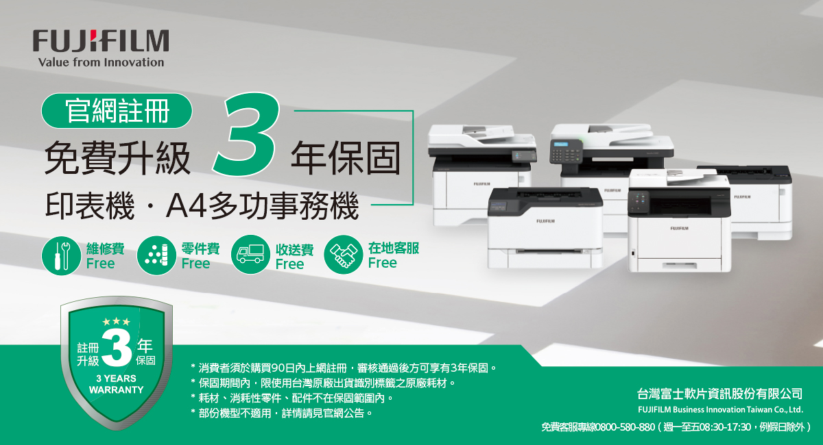 - 台灣富士軟片資訊股份有限公司為FUJIFILM「印表機、A4複合機及其耗材」之台灣原廠,提供購買其銷售產品之消費者產品保固及維修服務。